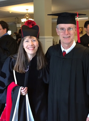 Father Ryan Rojo of the Diocese of San Angelo, Texas, and I wear academic birettas we each purchased from House of Hansen. His is the licentiate biretta (three horns) and mine is the doctoral one (four horns). Under my arm is a copy of Remembering God's Mercy I brought to give to a friend.